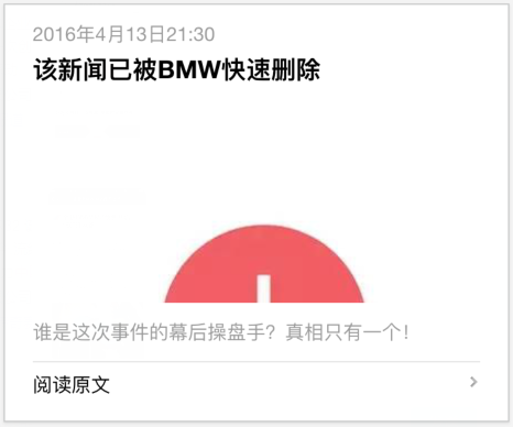 今年4月,宝马一个H5刷爆朋友圈!而其刷屏核心来源于创意——《该新闻已被BMW快速删除》,通过悬疑标题,加上牛逼的创意H5抓住大家的猎奇心理,进而引导用户传播。